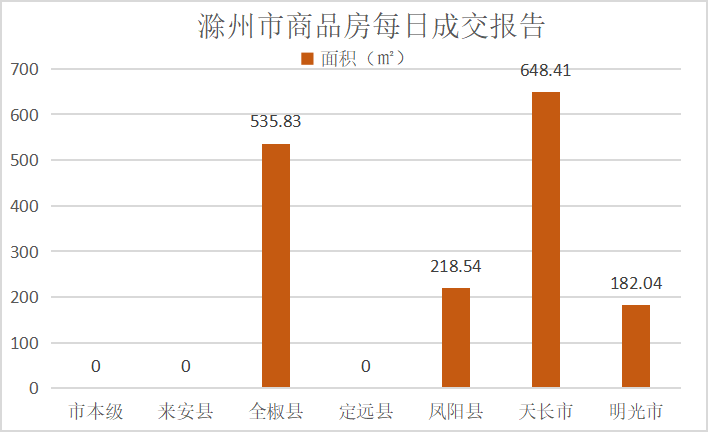 其中,市区商品房成交0套,成交面积0㎡;来安县商品房成交0套,成交面积0㎡;全椒县商品房成交6套,成交面积535.83㎡;定远县商品房成交0套,成交面积0㎡;凤阳县商品房成交2套,成交面积218.54㎡;天长市商品房成交17套,成交面积646.41㎡;明光市商品房成交2套,成交面积182.04㎡。