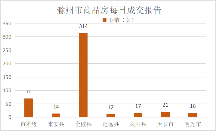 其中,市区商品房成交70套,成交面积5694.58㎡;来安县商品房成交14套,成交面积1374.98㎡;全椒县商品房成交314套,成交面积29802.23㎡;定远县商品房成交12套,成交面积917.29㎡;凤阳县商品房成交17套,成交面积1632.12㎡;天长市商品房成交21套,成交面积1207.18㎡;明光市商品房成交16套,成交面积1640.78㎡。