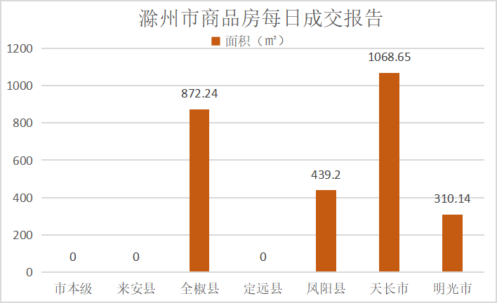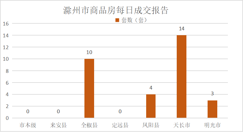 其中,市区商品房成交0套,成交面积0㎡;来安县商品房成交0套,成交面积0㎡;全椒县商品房成交10套,成交面积872.24㎡;定远县商品房成交0套,成交面积0㎡;凤阳县商品房成交4套,成交面积439.2㎡;天长市商品房成交14套,成交面积1068.65㎡;明光市商品房成交3套,成交面积310.14㎡。